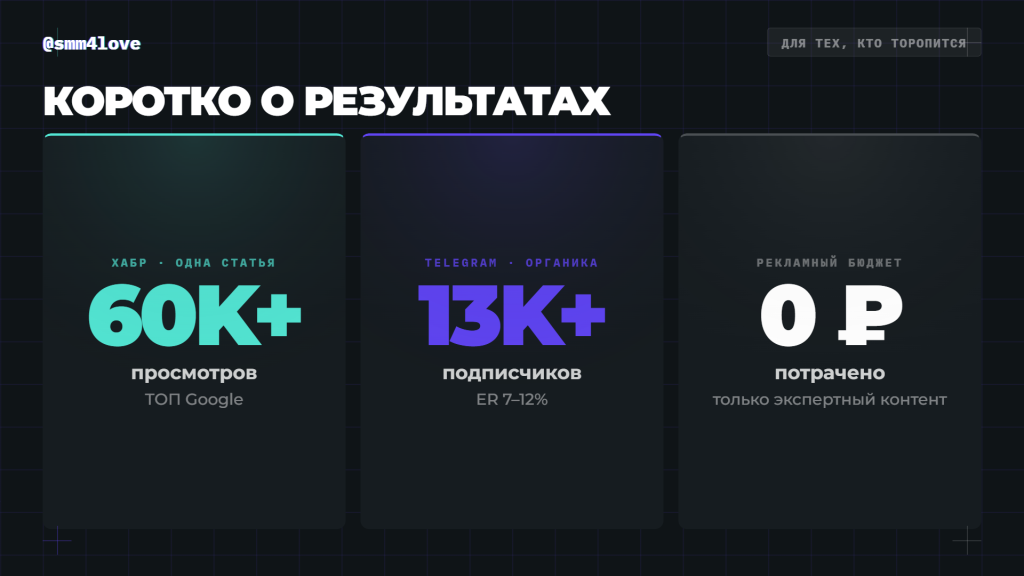 • Результат: 13 000+ подписчиков, ER 7–12%
