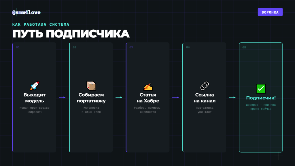 Обзорные статьи мы сейчас выпускаем редко, только еженедельные дайджесты. Канал при этом продолжает медленно расти, потому что старые статьи до сих пор висят в топе поисковиков. «FLUX локально», «портативная нейросеть», «запустить AI без облака». Люди находят, читают, переходят, подписываются. Это и есть главное преимущество такого контента перед рекламой: он не заканчивается, когда заканчивается бюджет.