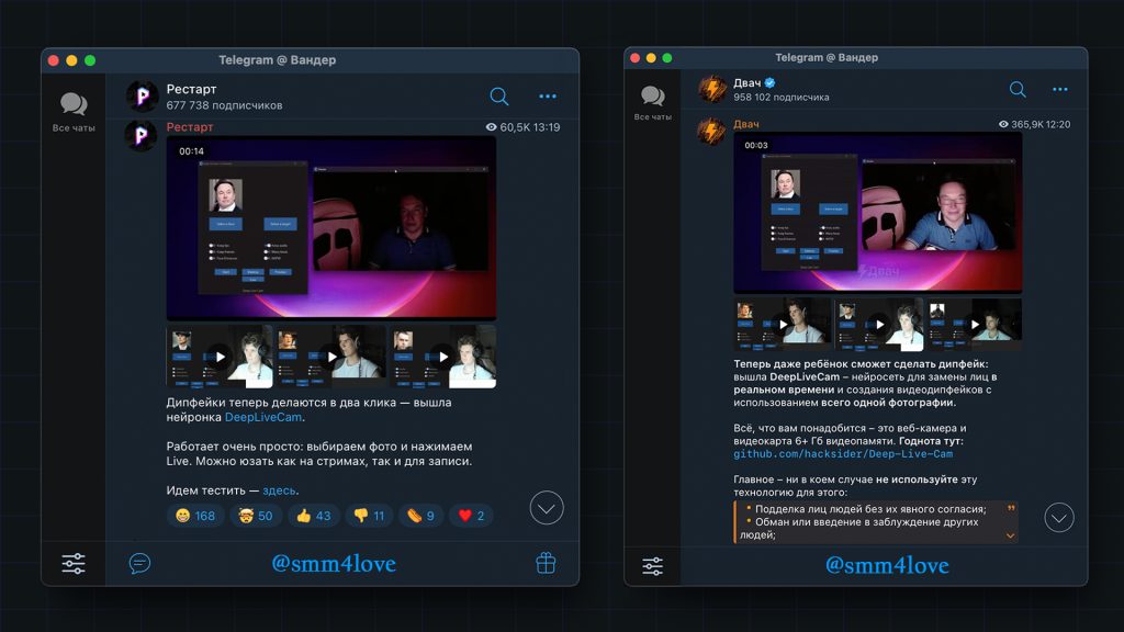 В итоге мои скрины разлетелись по каналам-миллионникам. Кадры с моим личиком взял Рестарт — 600К подписчиков. Потом Двач — 900К. Потом Пекарня — 1,1М. А потом я бегал с одним горящим местом и просил их указать источник.